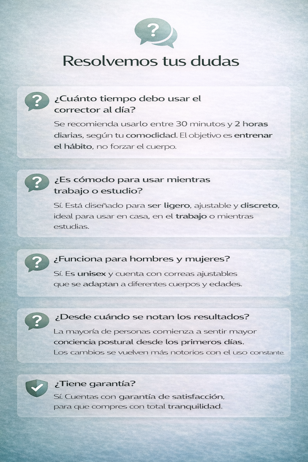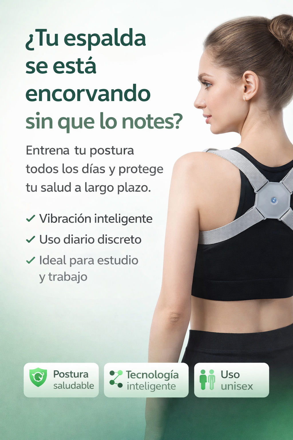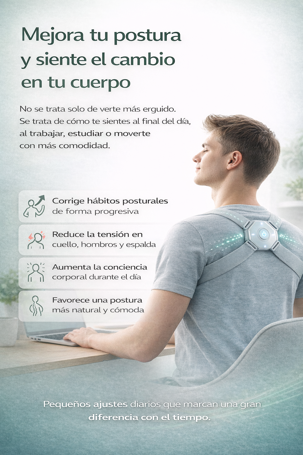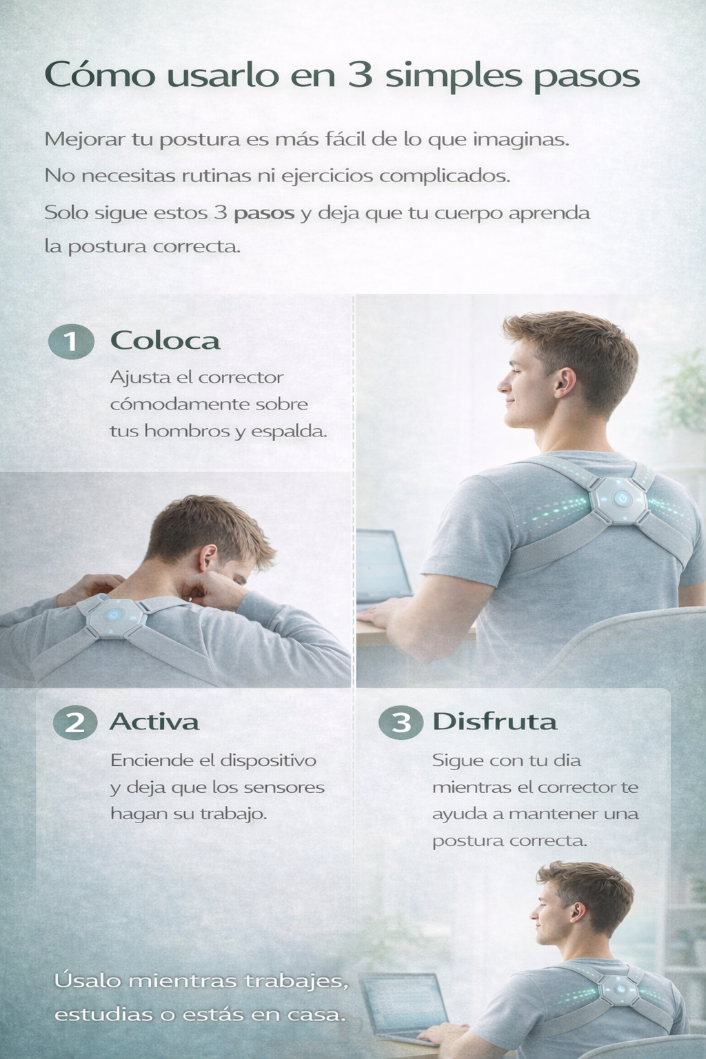 EL CORRECTOR POSTURA Es un dispositivo que generalmente se lleva en la espalda y que utiliza sensores para detectar cuando tu postura se encorva. Al detectar una mala postura, el corrector puede emitir vibraciones, luces o sonidos como señal de alerta, o incluso ajustar su posición para ayudarle a enderezarse.